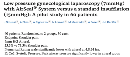 There have been several studies, but this randomized pilot study looked at pain. They split patients into two groups - one group was operated on with AirSeal® at 7mmHg and one group with 12-15 mmHg.